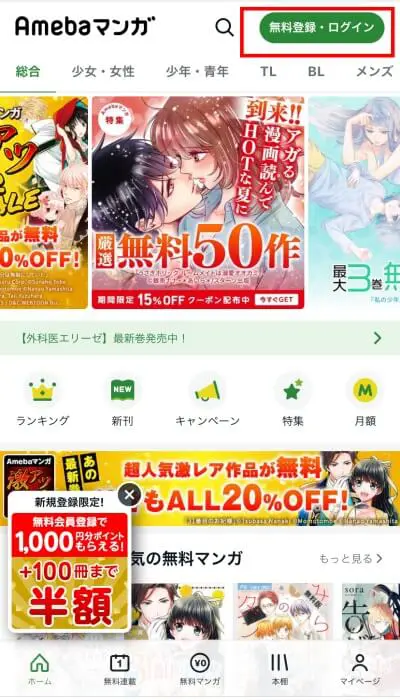 Amebaマンガの特徴や会員登録方法を紹介しました。新規会員登録でもらえる100冊まで半額クーポンは他と比べても秀でています。