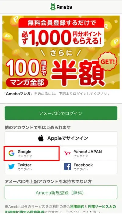 - アメーバ会員でなく、GoogleやFacebookなどのアカウントでAmebaマンガにログイン→ログインと同時にAmeba会員のIDが自動で作られる