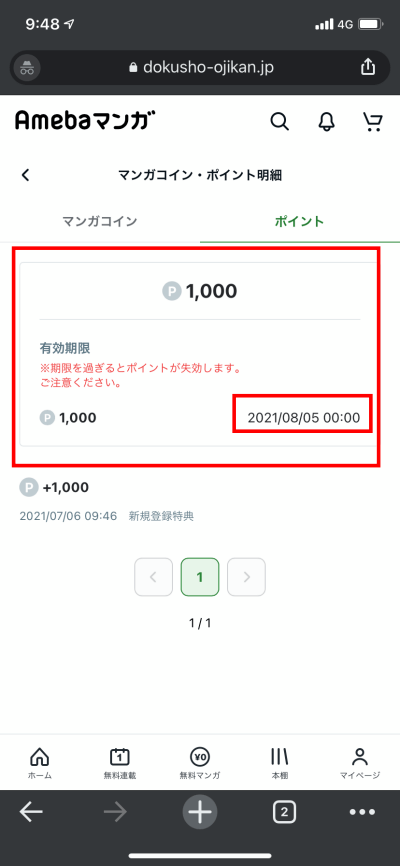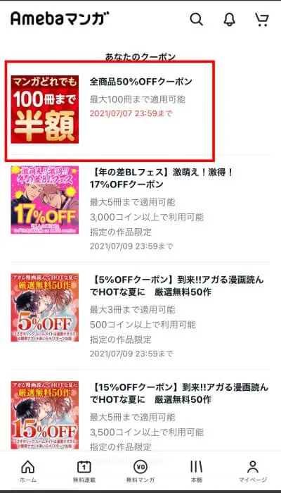 Amebaマンガの新規登録時にもらえる初回限定クーポンの有効期限は短め。