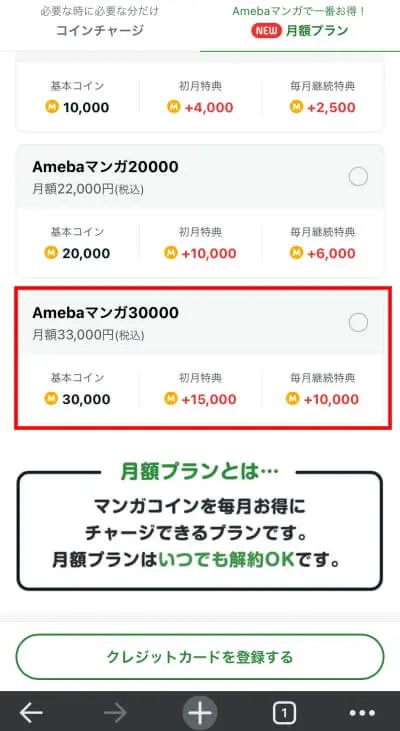 Amebaマンガには、都度課金プランと月額コースがあります。月額コースですと初月実質無料キャンペーンがおトクです。