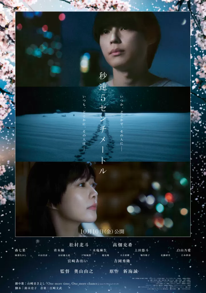遠野貴樹[松村北斗] 篠原明里[高畑充希] 澄田花苗[森七菜] 高校生 遠野貴樹[青木柚] 水野理紗[木竜麻生] 幼少期 遠野貴樹[上田悠斗] 幼少期 篠原明里[白山乃愛] 輿水美鳥[宮﨑あおい] 小川龍一[吉岡秀隆]
