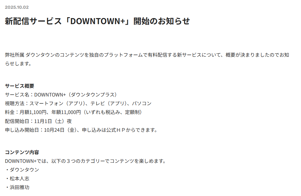 吉本興業が10月2日の公式サイトを通じて、「ダウンタウンプラス」というサービスを新しく配信すると発表しました。